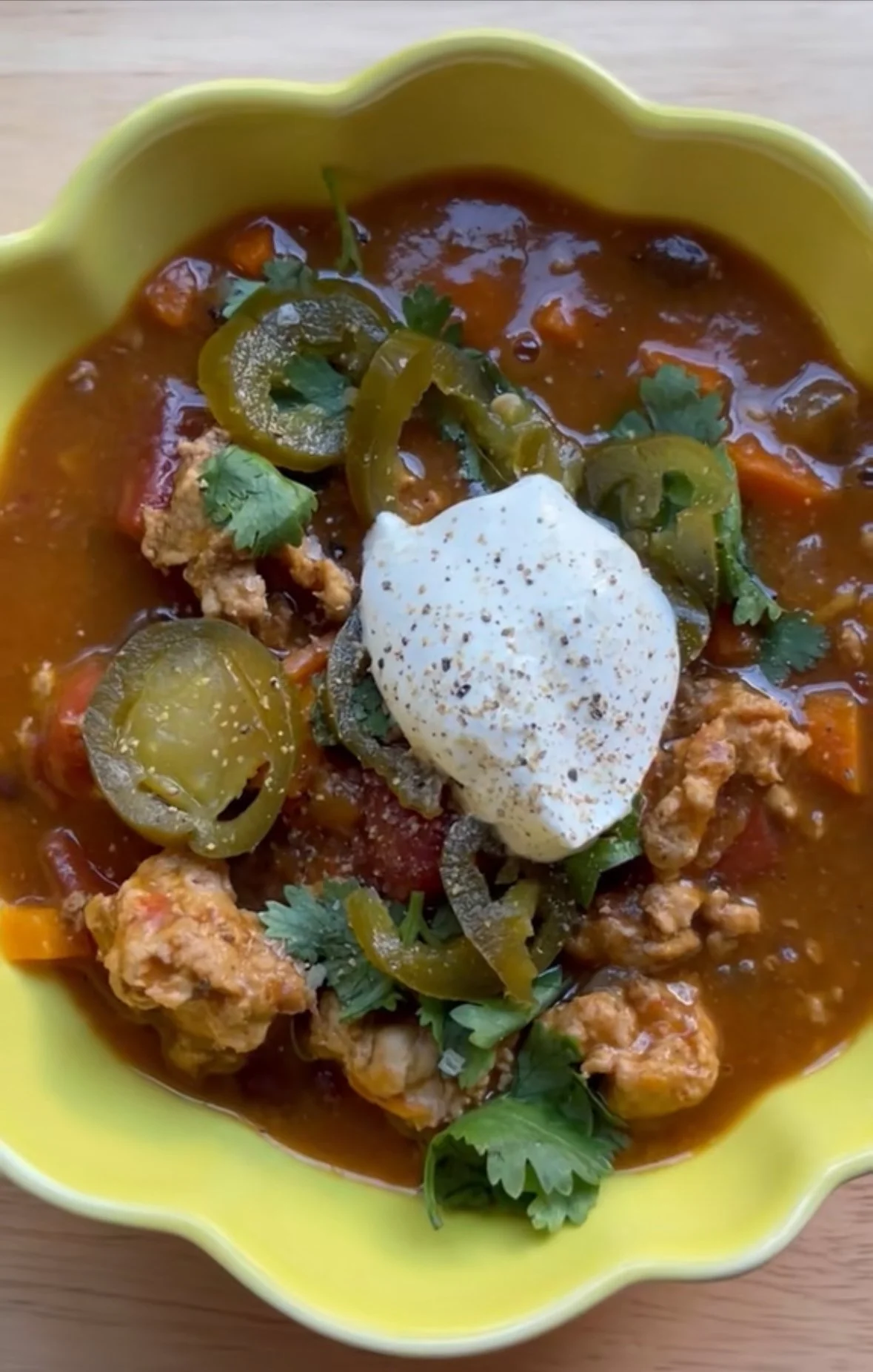 Once the chili is thickened and flavorful, give it a good stir and serve hot. Top with your favorite garnishes— I love a dollop of sour cream, some tamed jalapeño slices, and fresh cilantro.